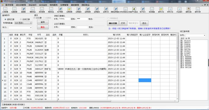为加强专用线、专用铁路货物运输管理,进一步提高专用线管理水平及货运服务质量。我公司研发的专用线交接系统,对进出专用线车辆自动识别车号,保存车辆影像资料,机检信息传入货运站系统,为路企交接提供依据,并生成货车调送单,避免了路企双方对货车延时占用费的意见和分歧。可查询专用线电子台账,同时采用无线手持机进行数据时事跟踪,及时办理车辆进出。